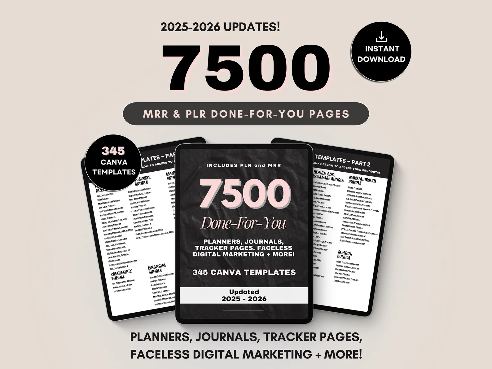 Unlock your content creation potential with this massive 7500 Done-For-You Canva Template Bundle for 2025-2026! Designed for marketers, business owners, and digital creators, this bundle includes fully editable PLR (Private Label Rights) and MRR (Master Resell Rights) templates, allowing you to save hours of work and create high-quality digital products instantly.